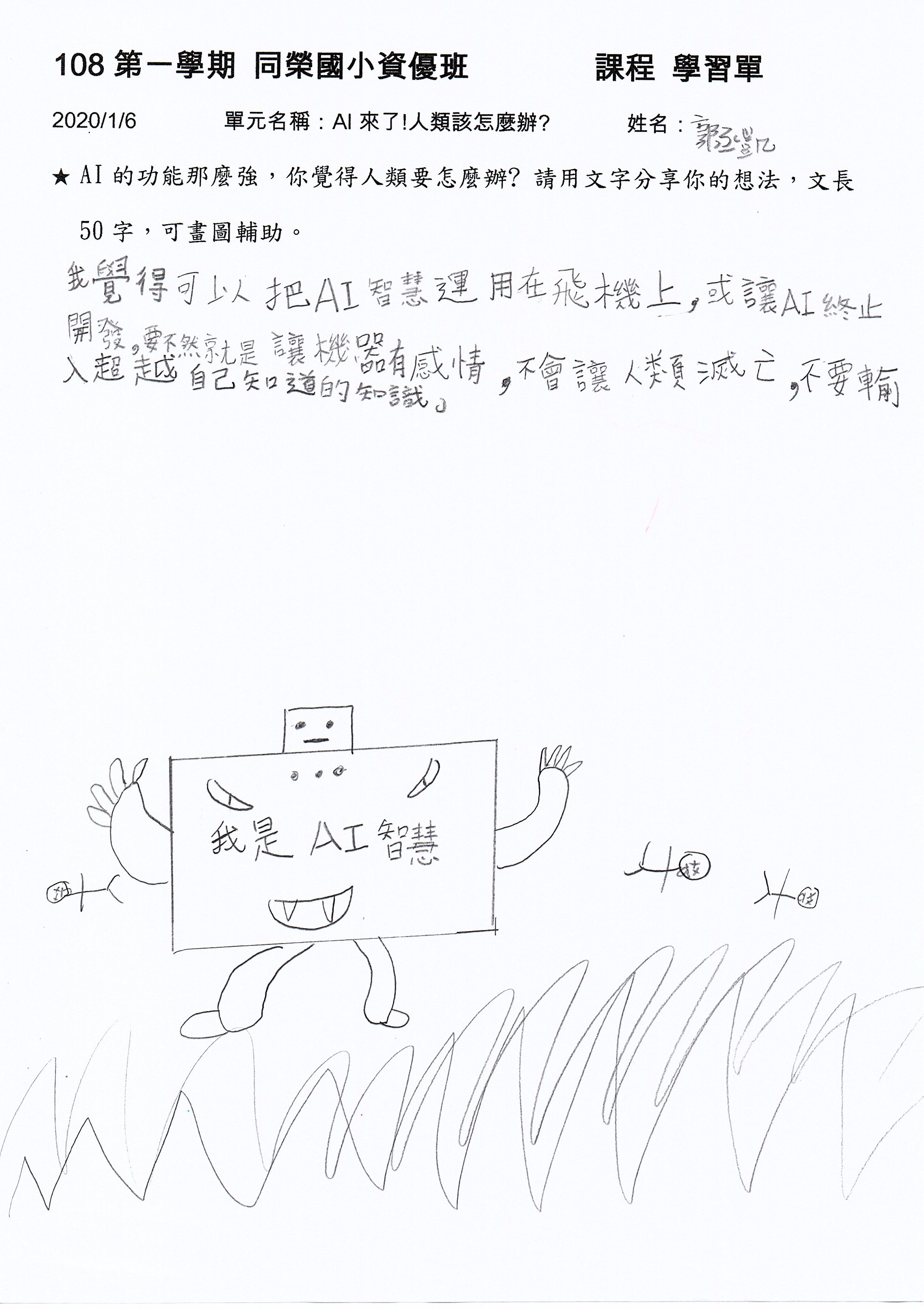 我覺得可以把AI智慧運用在飛機上,或讓AI終止開發。要不然就是讓機器有感情,不會讓人類滅亡,不要輸入超越自己知道的知識。