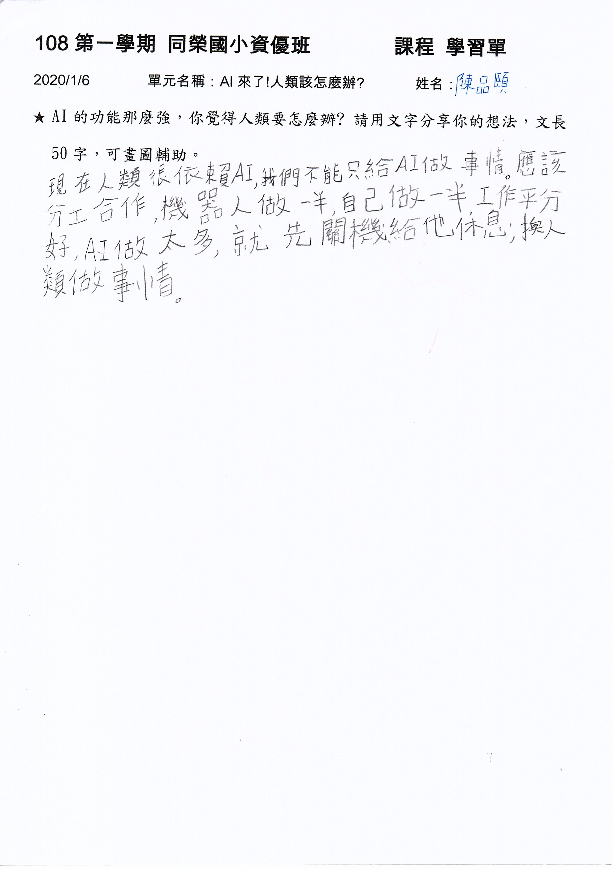 現在人類很依賴AI,我們不能只給AI做事情。應該分工合作,機器人做一半,自己做一半。工作平分好。AI做太多,就先關機給他休息,換人類做事情。