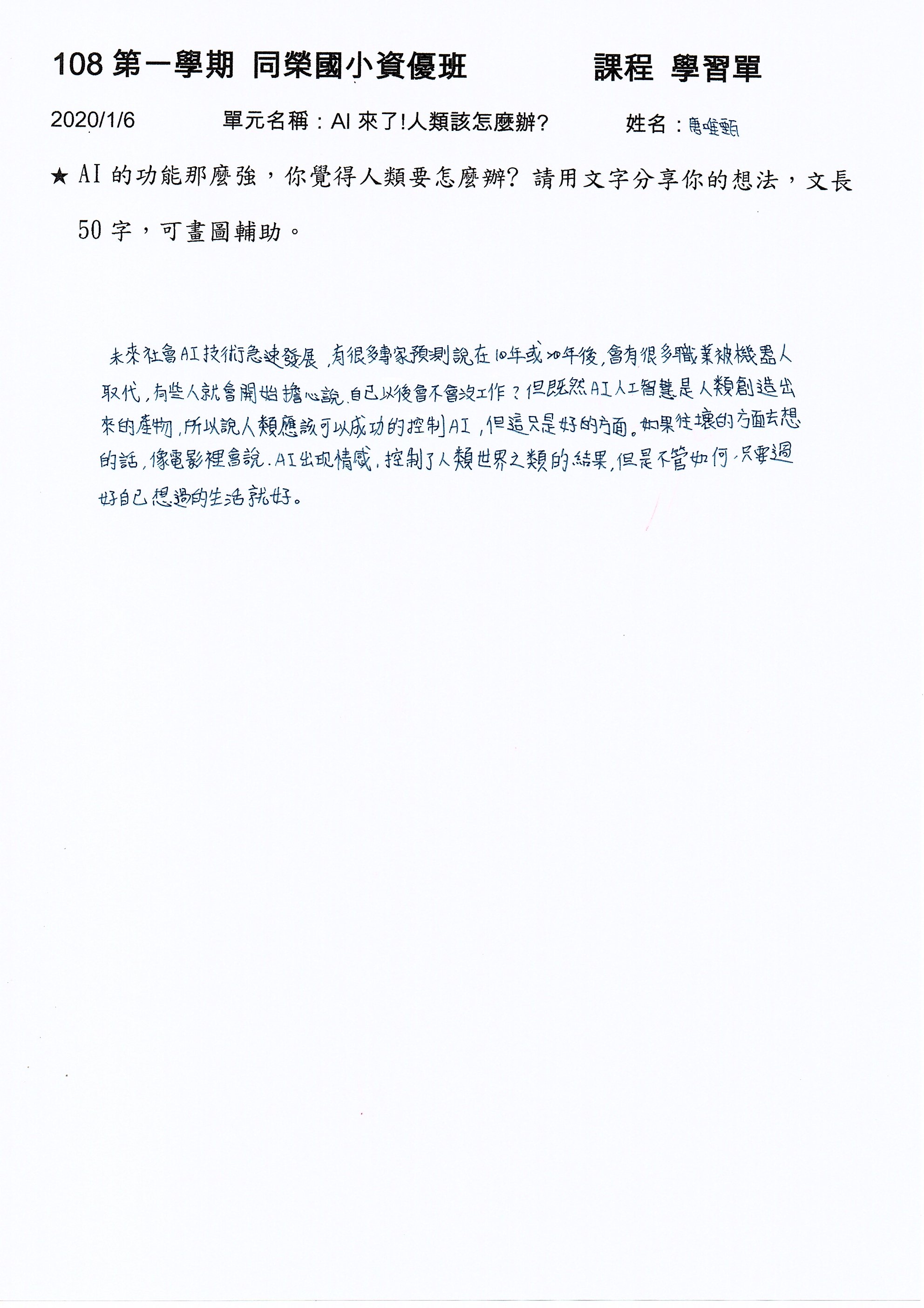 未來社會AI技術急速發展,有很多專家預測說在10年或20年後,會有很多職業被機器人取代,有些人就會開始擔心說,自己以後會不會沒工作? 但既然AI人工智慧是人類創造出來的產物,人類應該可以成功控制AI。但這只是好的方面,如果往壞的方面去想,像電影會說,AI出現情感,控制了人類世界之類的結果...等。但是不管如何,只要過好自己想過的生活就好。