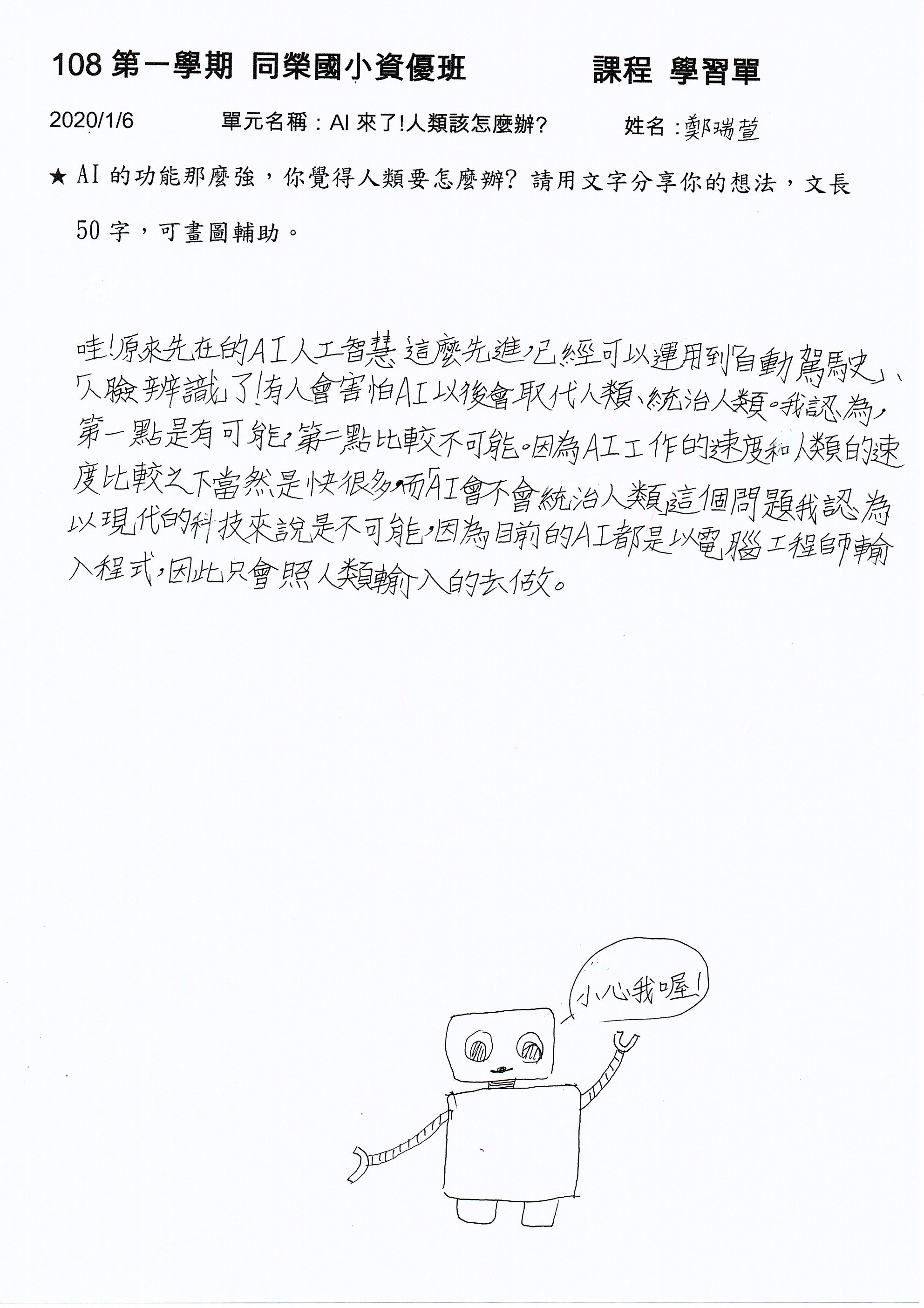 哇!原來現在的AI人工智慧這麼先進,已經可以運用到"自動駕駛"、"人臉辨識"了!有人會害怕AI以後會取代人類、統治人類。我認為第一點是有可能,第二點比較不可能。因為AI工作速度和人類速度比較之下當然是快很多,而"AI會不會統治人類"這個問題我認為以現在科技來說是不可能,因為目前的AI都是以電腦工程師輸入程式,因此只會照人類輸入的去做。