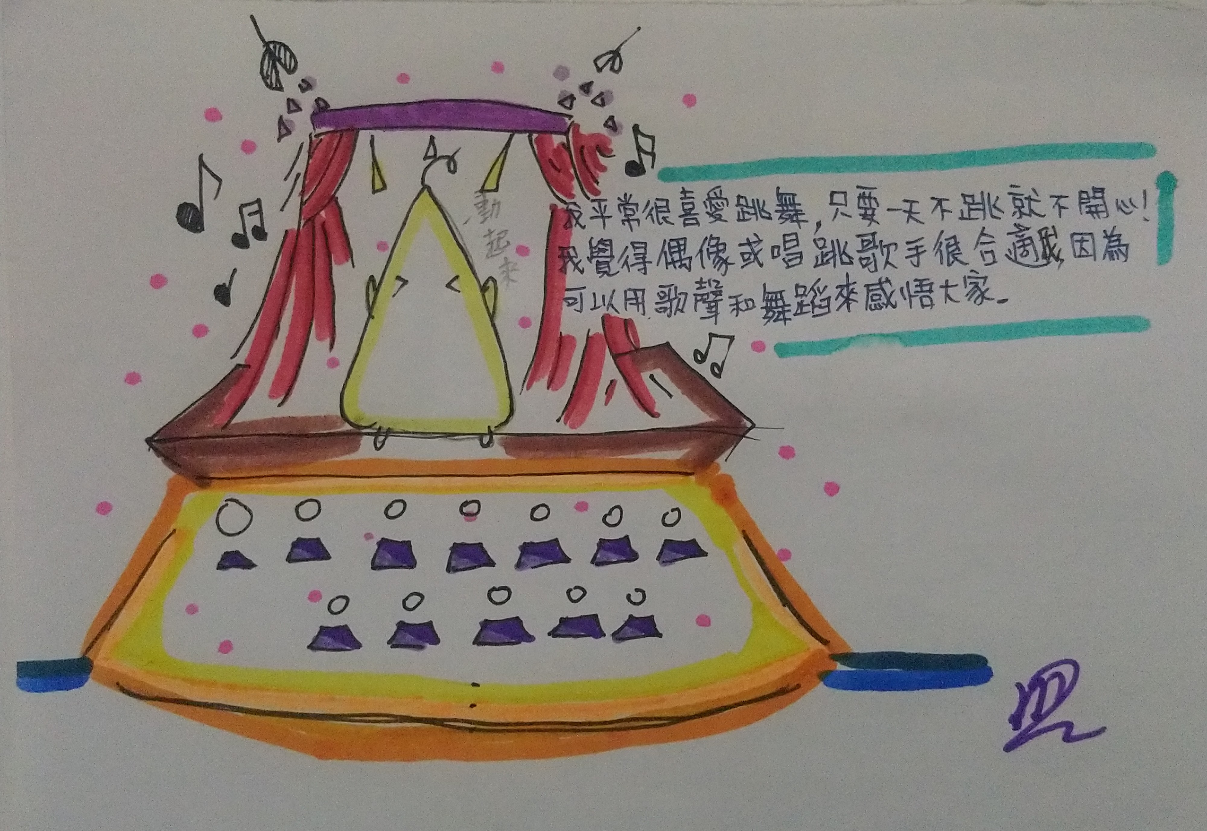 我平常很喜愛跳舞,只要一天不跳就不開心!我覺得偶像或唱跳歌手很適合我,因為可以用歌聲和舞蹈來感悟大家.