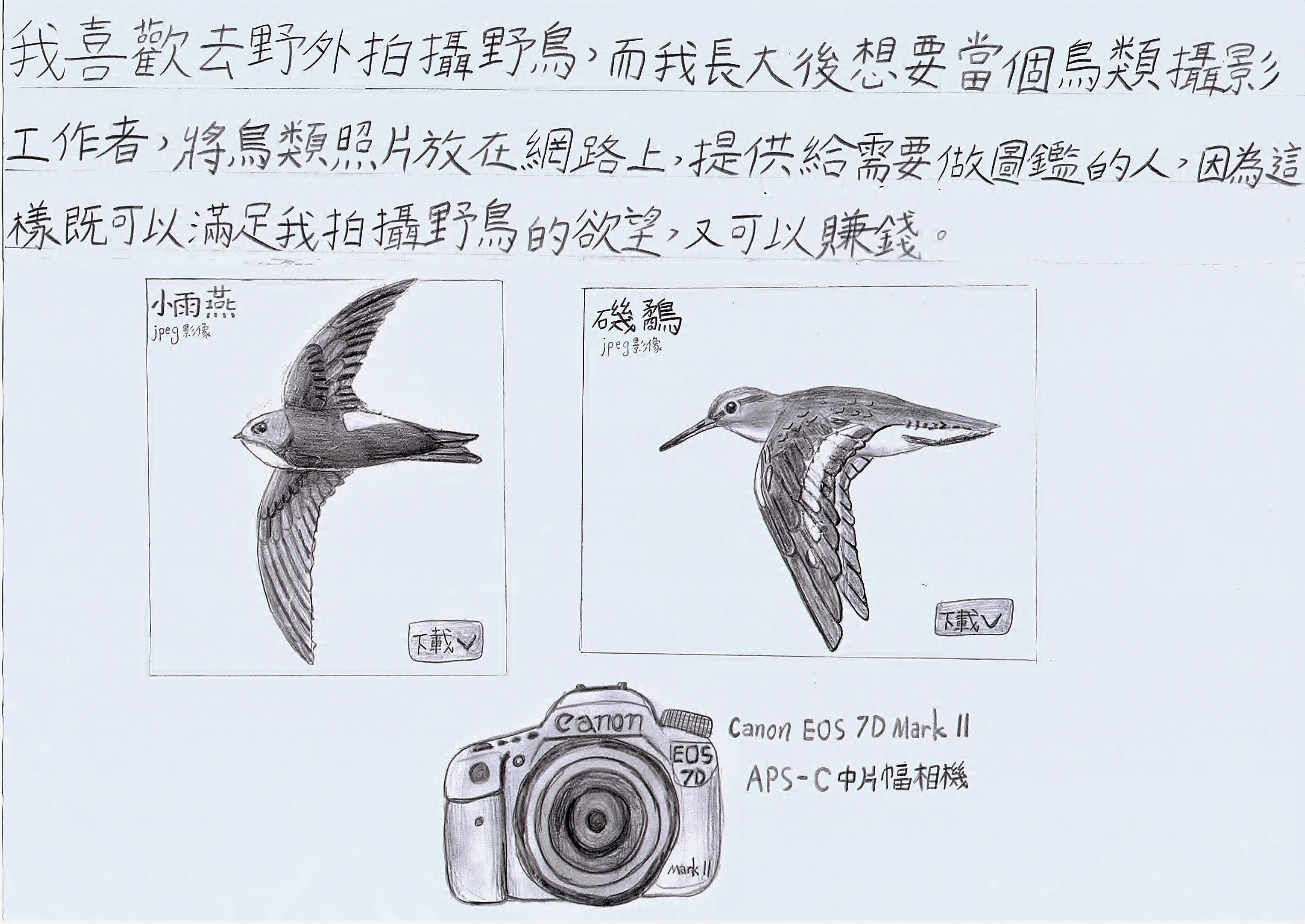 我喜歡去野外拍攝野鳥,而我長大後想要當個鳥類攝影工作者,將鳥類照片放在網路上,提供給需要作圖鑑的人,因為這樣既可以滿足我拍攝野鳥的欲望,又可以賺錢。