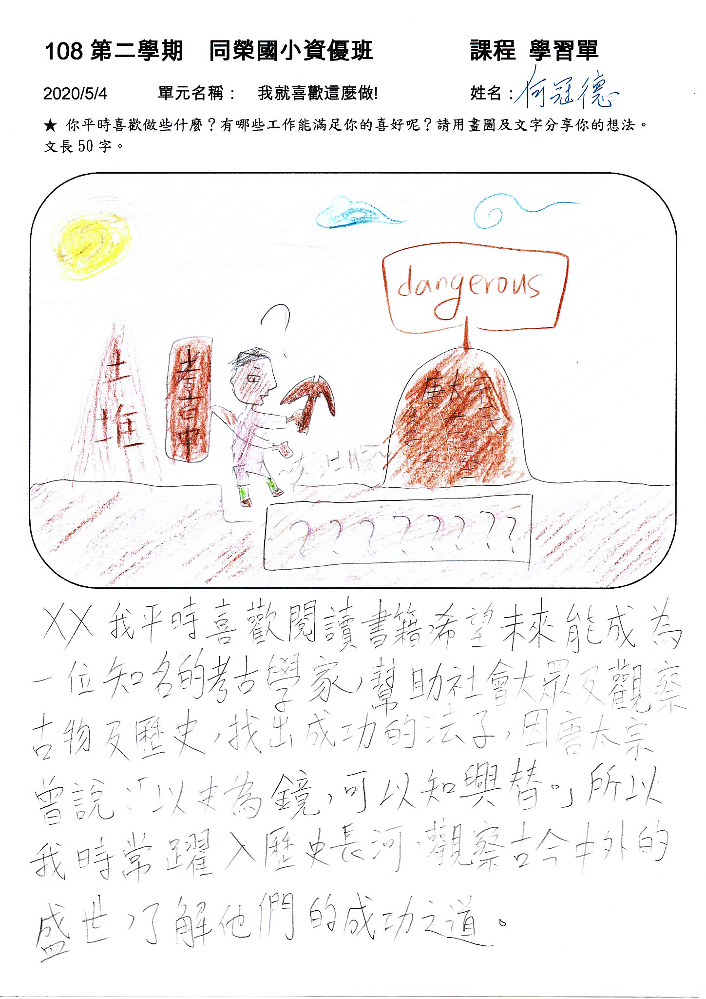 我平時喜歡閱讀書籍,希望未來能成為一位知名的考古學家,幫助社會大眾及觀察古物及歷史,找出成功的法子,因唐太宗曾說:「以史為鏡,可以知興替。」所以我時常躍入歷史長河,觀察古今中外的盛世,了解他們的成功之道。