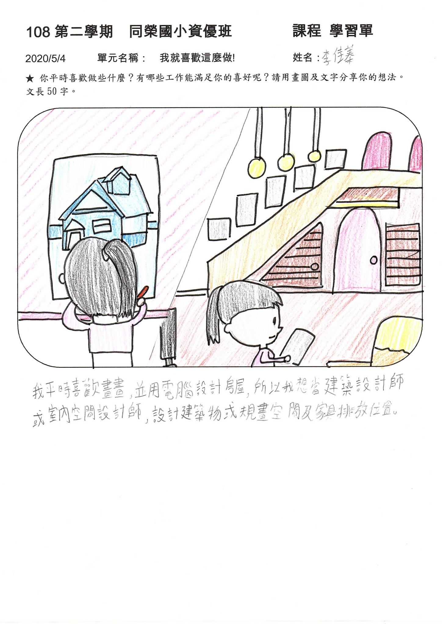 我平時喜歡畫畫,並用電腦設計房屋,所以我想當建築設計師或室內空間設計師,設計建築物或規劃空間及家具排放位置。
